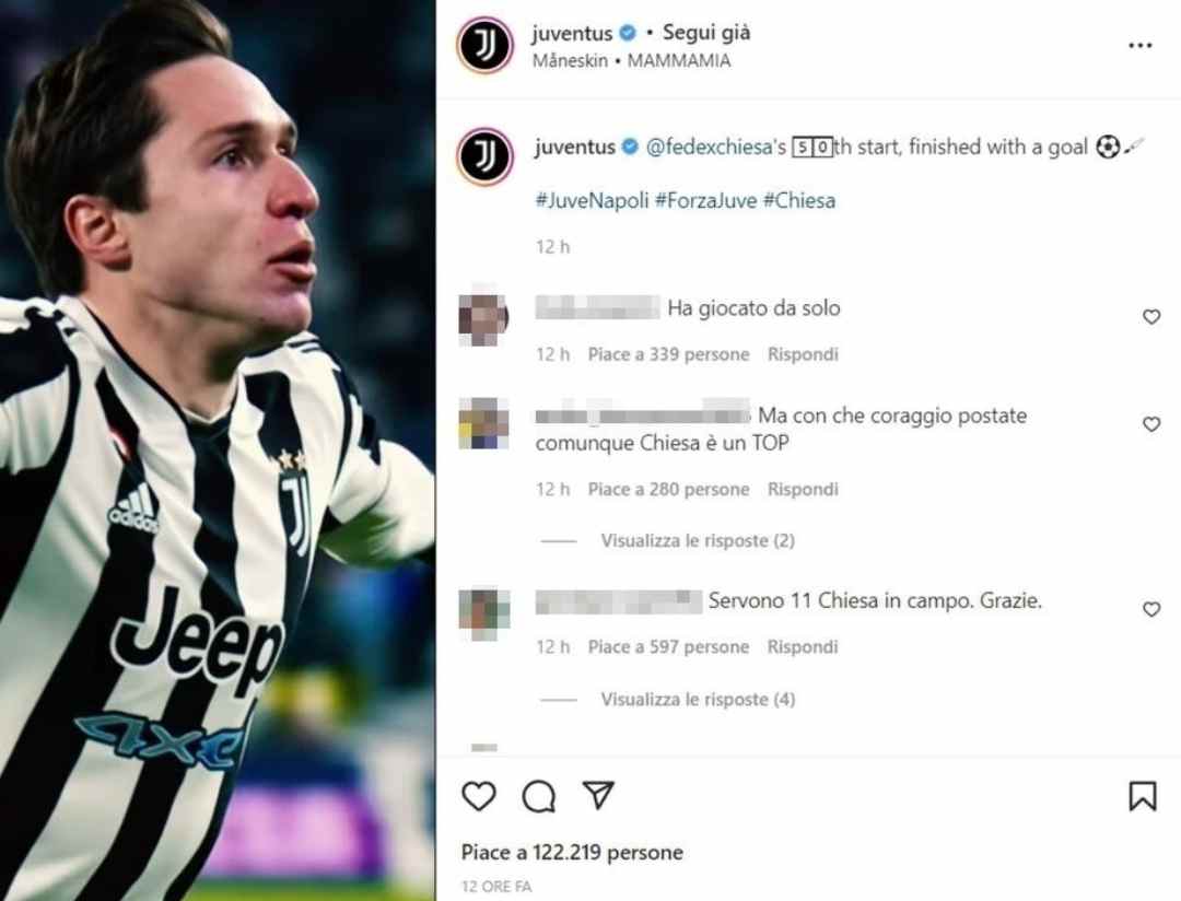 Ecco lo screen, preso dal post Instagram della Juventus, in cui possiamo notare come i tifosi riconoscano l’importanza di Chiesa, unico ad aver dato tutto contro il Napoli