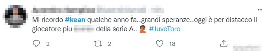 Sui social è partita una vera e propria campagna contro un giocatore che non è mai riuscito a dimostrare di avere i crismi per imporsi in un club come quello bianconero. Il futuro di Kean è lontano dalla Juventus con la società che, nel prossimo mercato estivo, cercherà una sistemazione per il centravanti classe 2000.